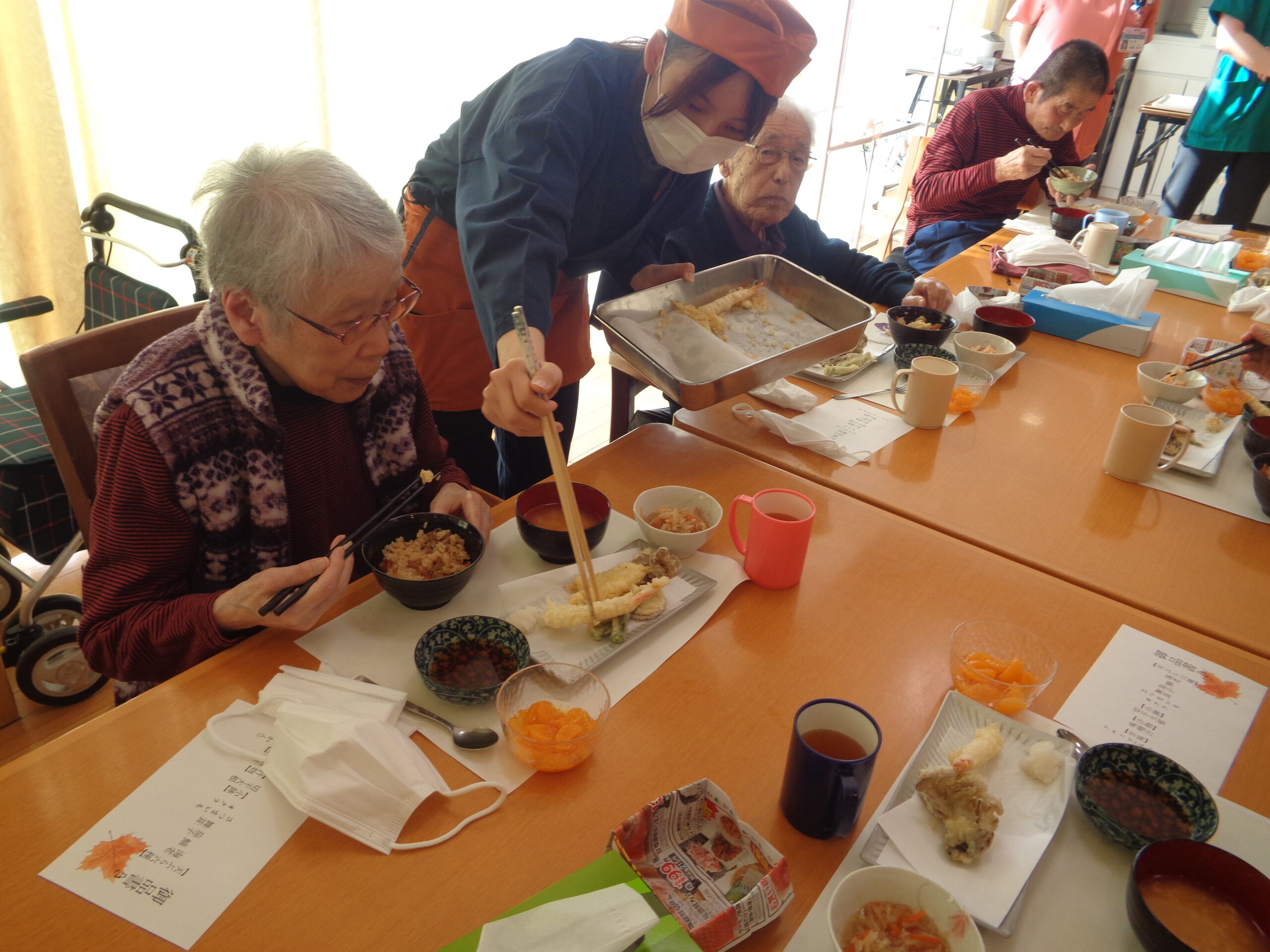 11/26㈫にショートステイでは、施設内でユニット調理を行っている食事提供業者主催の『天ぷらレクリエーション』を行いました😀