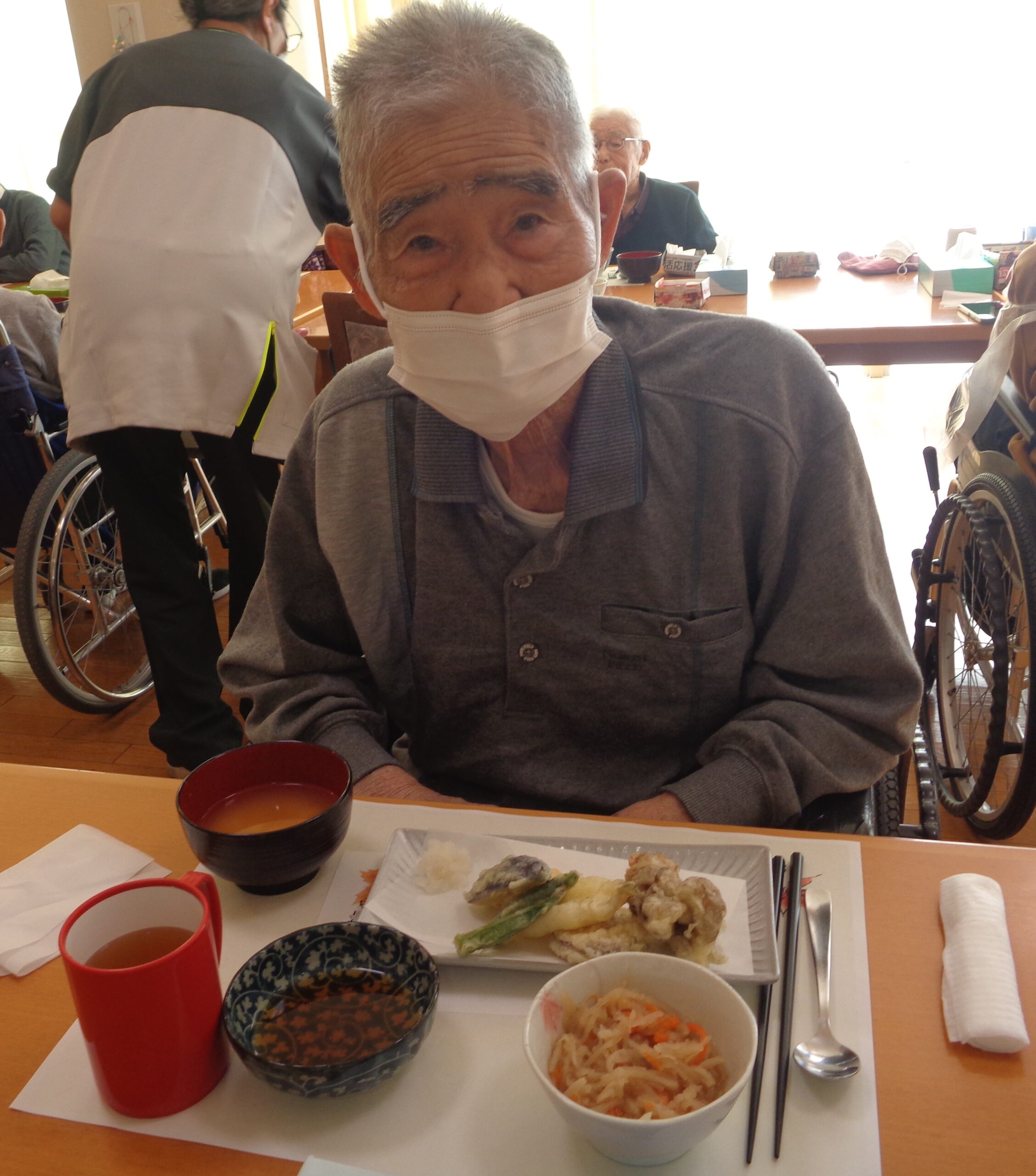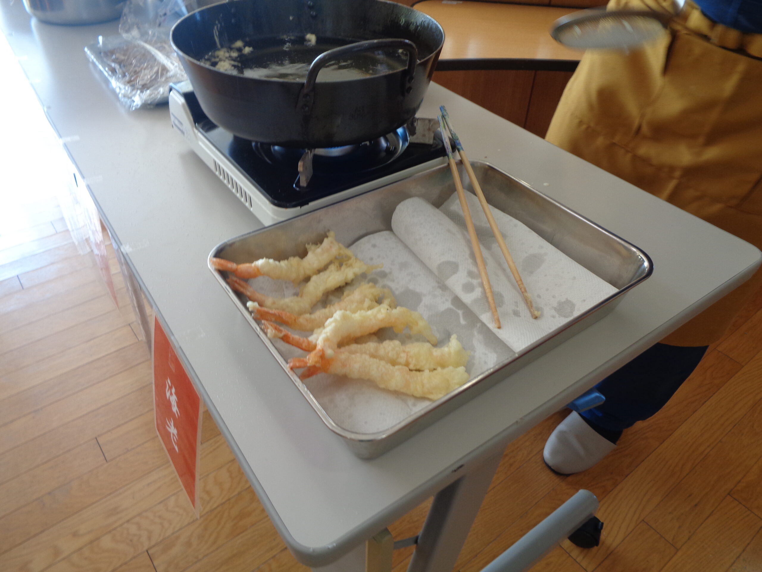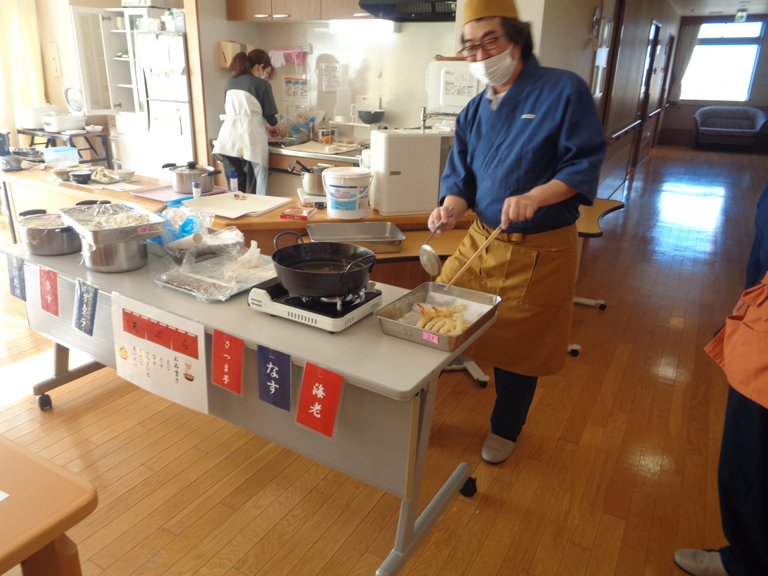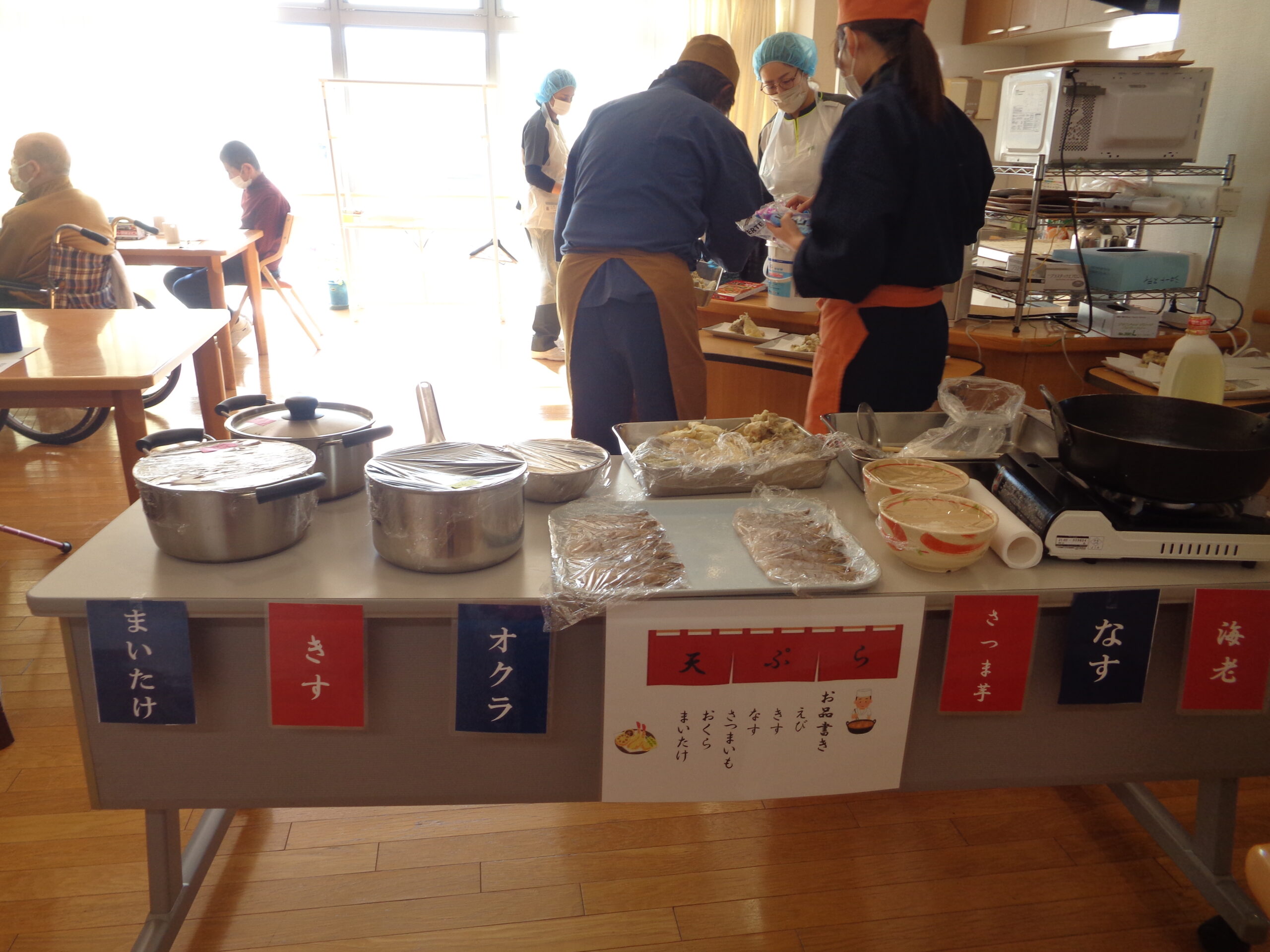 11/26㈫にショートステイでは、施設内でユニット調理を行っている食事提供業者主催の『天ぷらレクリエーション』を行いました😀