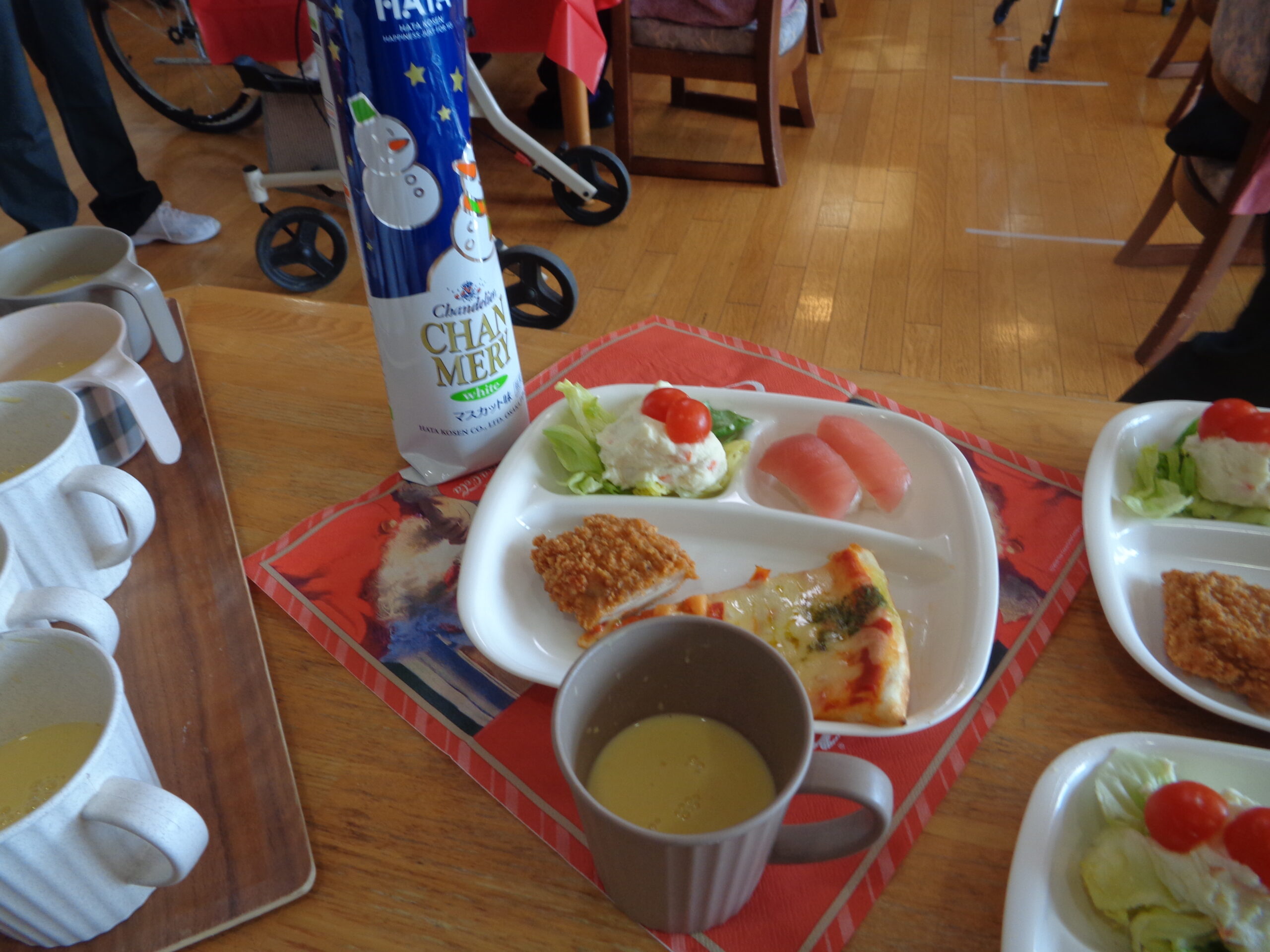 今年は昼食にチキン、お寿司、ピザ、ポテトサラダ、コーンスープを召し上がって頂きました🥂