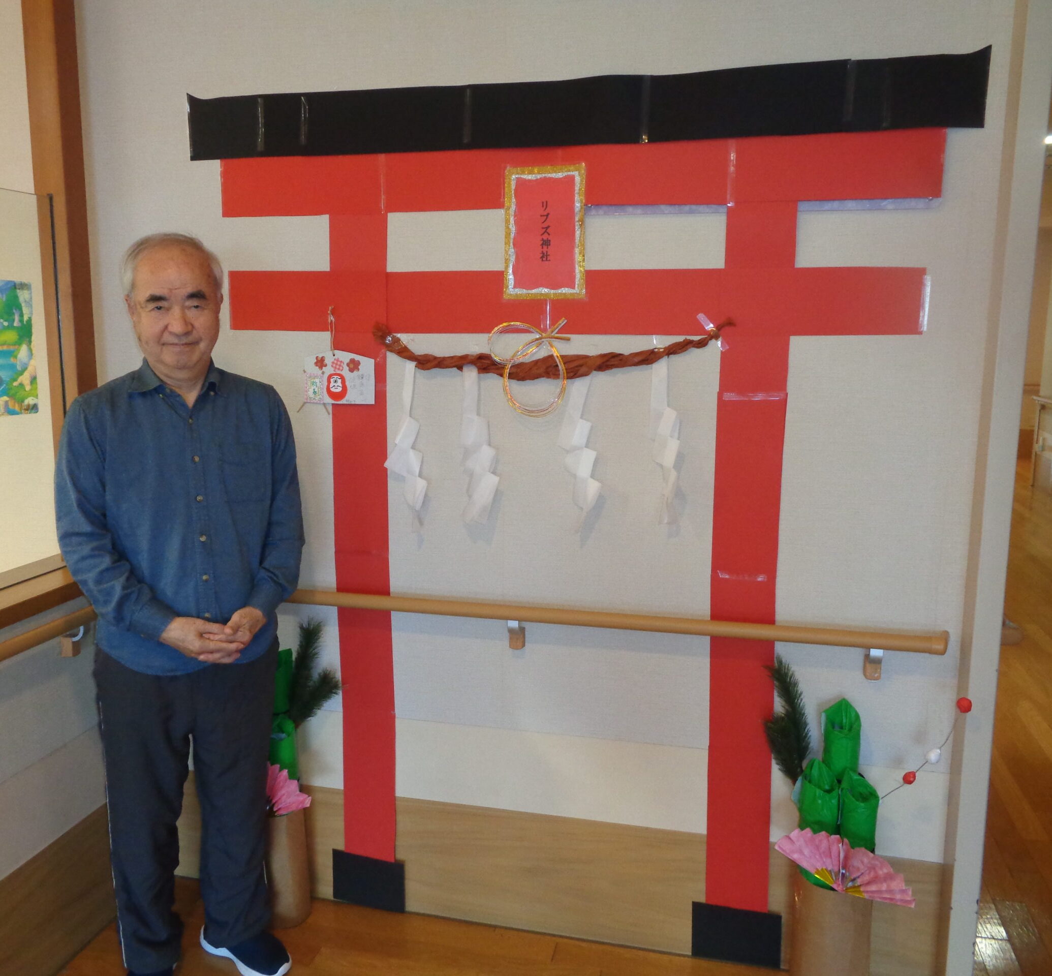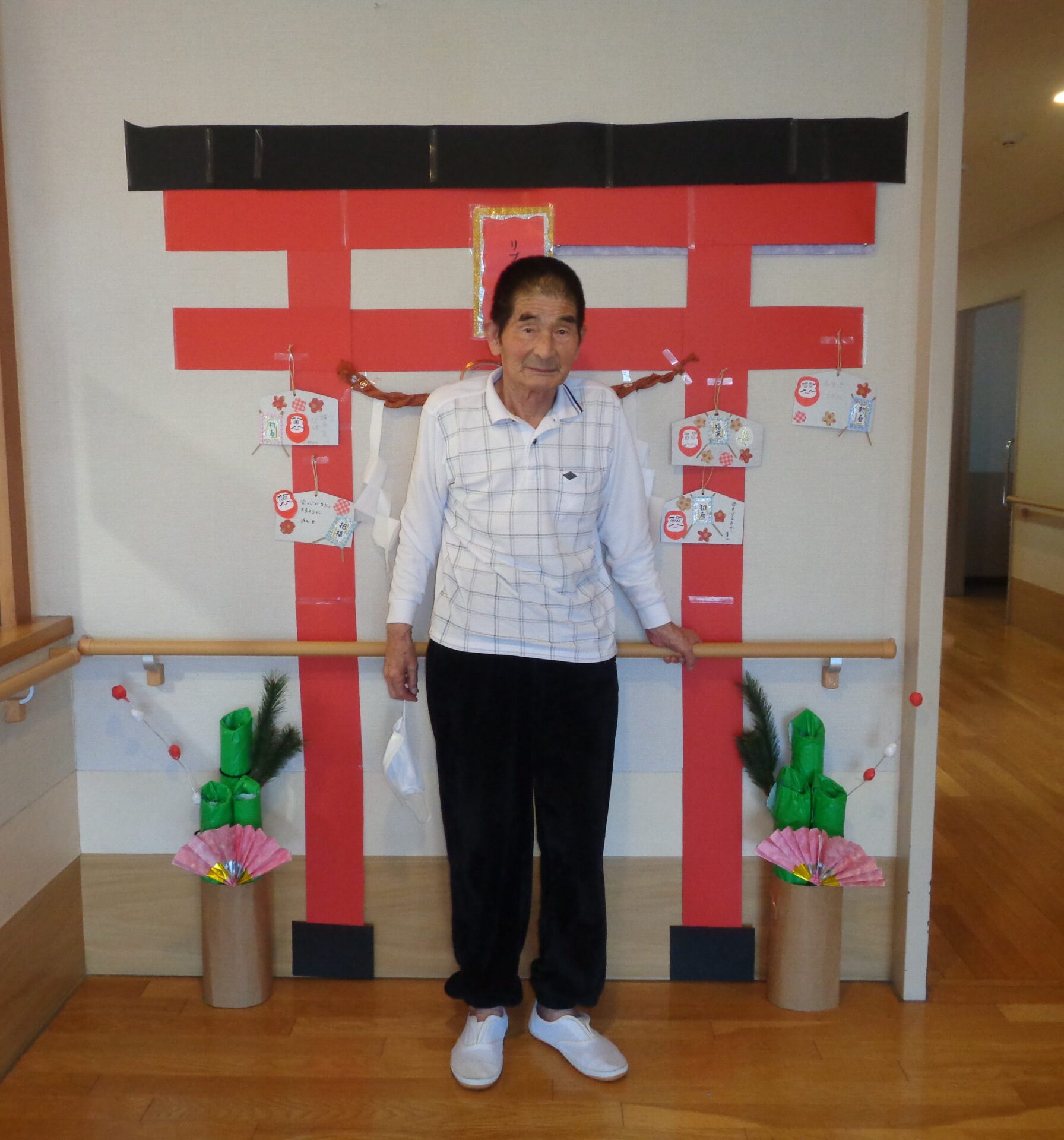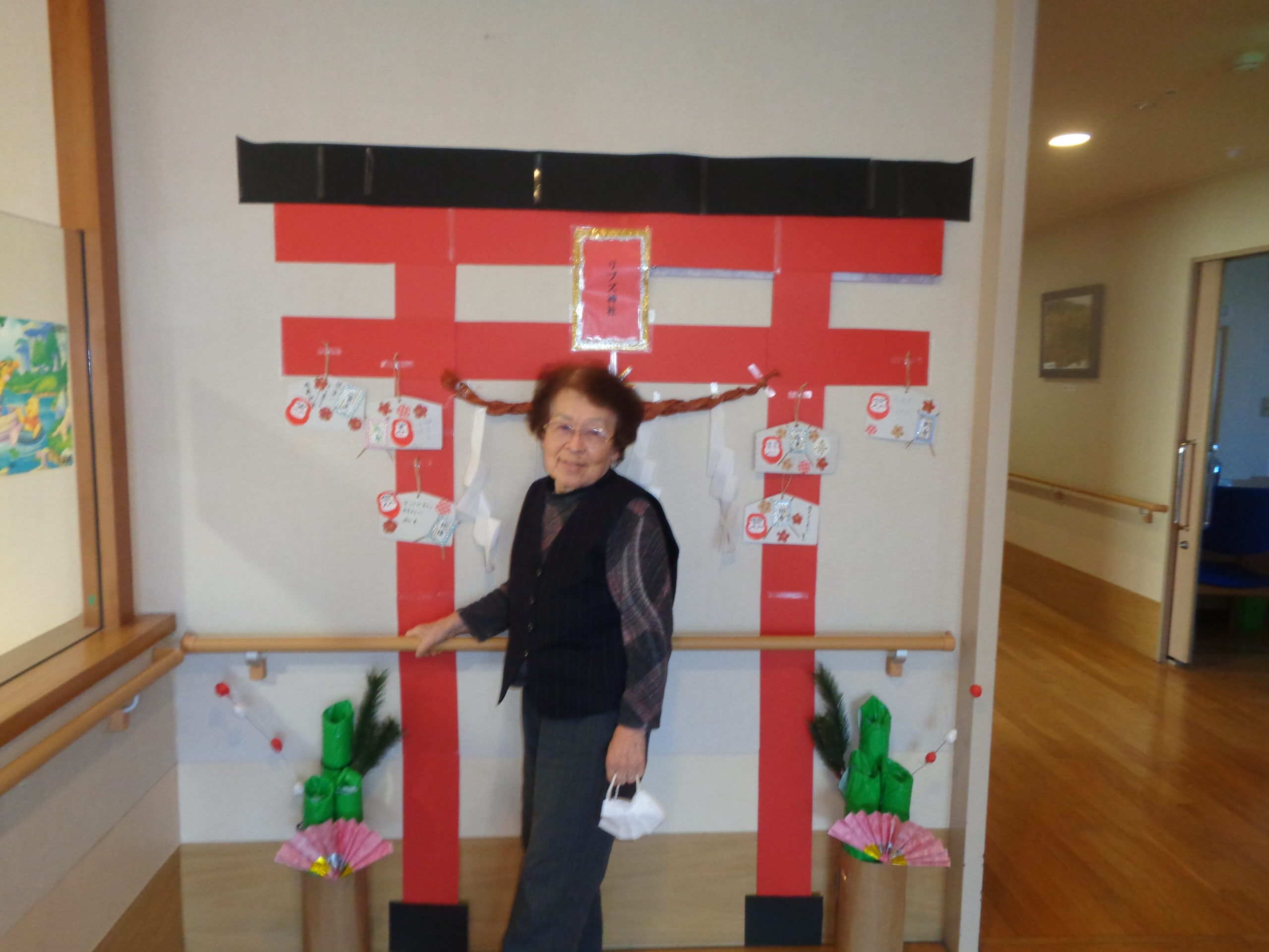 ショートステイでは今年も職員が作成した鳥居と門松を飾り、利用者様が絵馬を書き飾りました⛩️