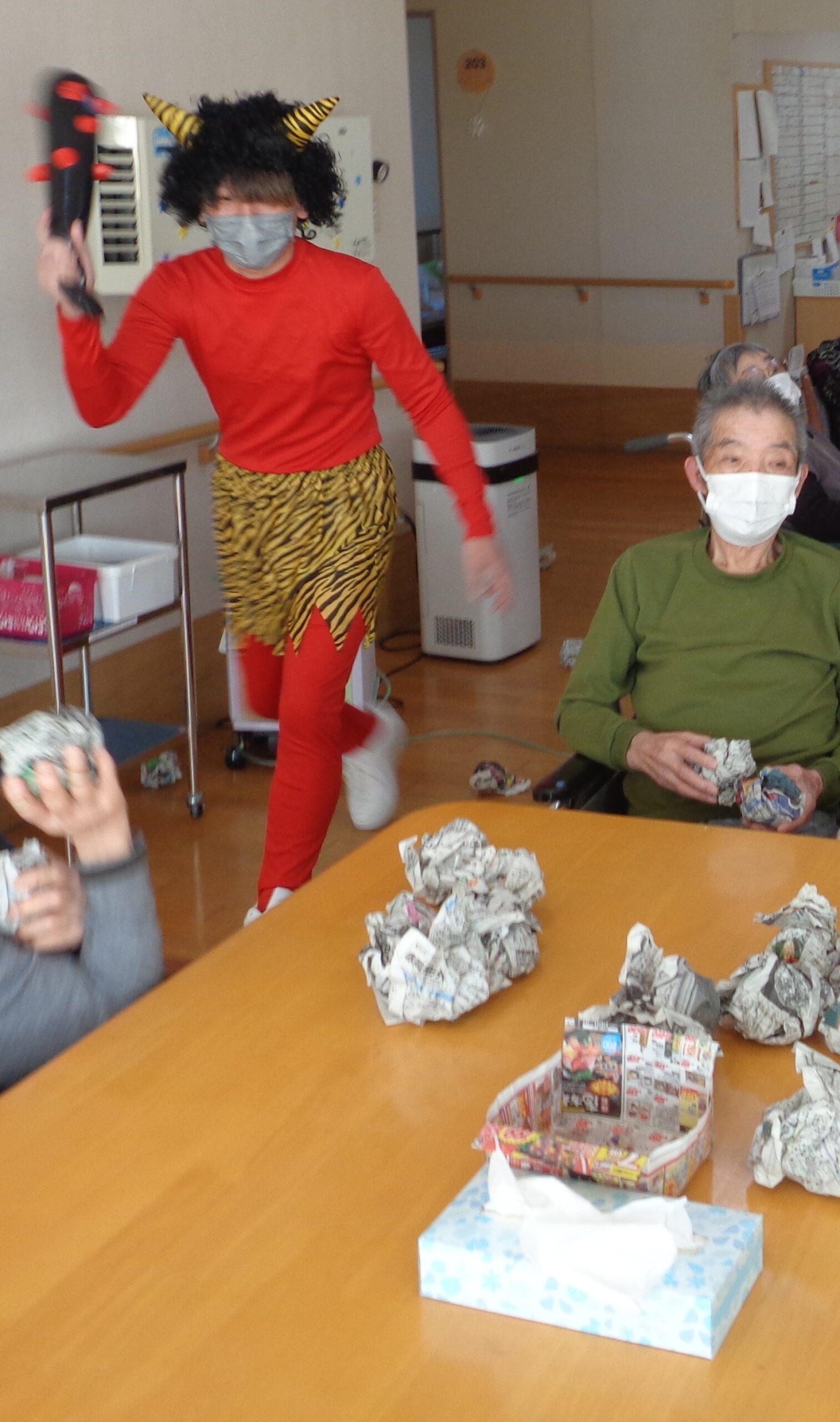 職員が鬼になり、新聞紙で作った豆を利用者様が投げて『豆まき』をしました。