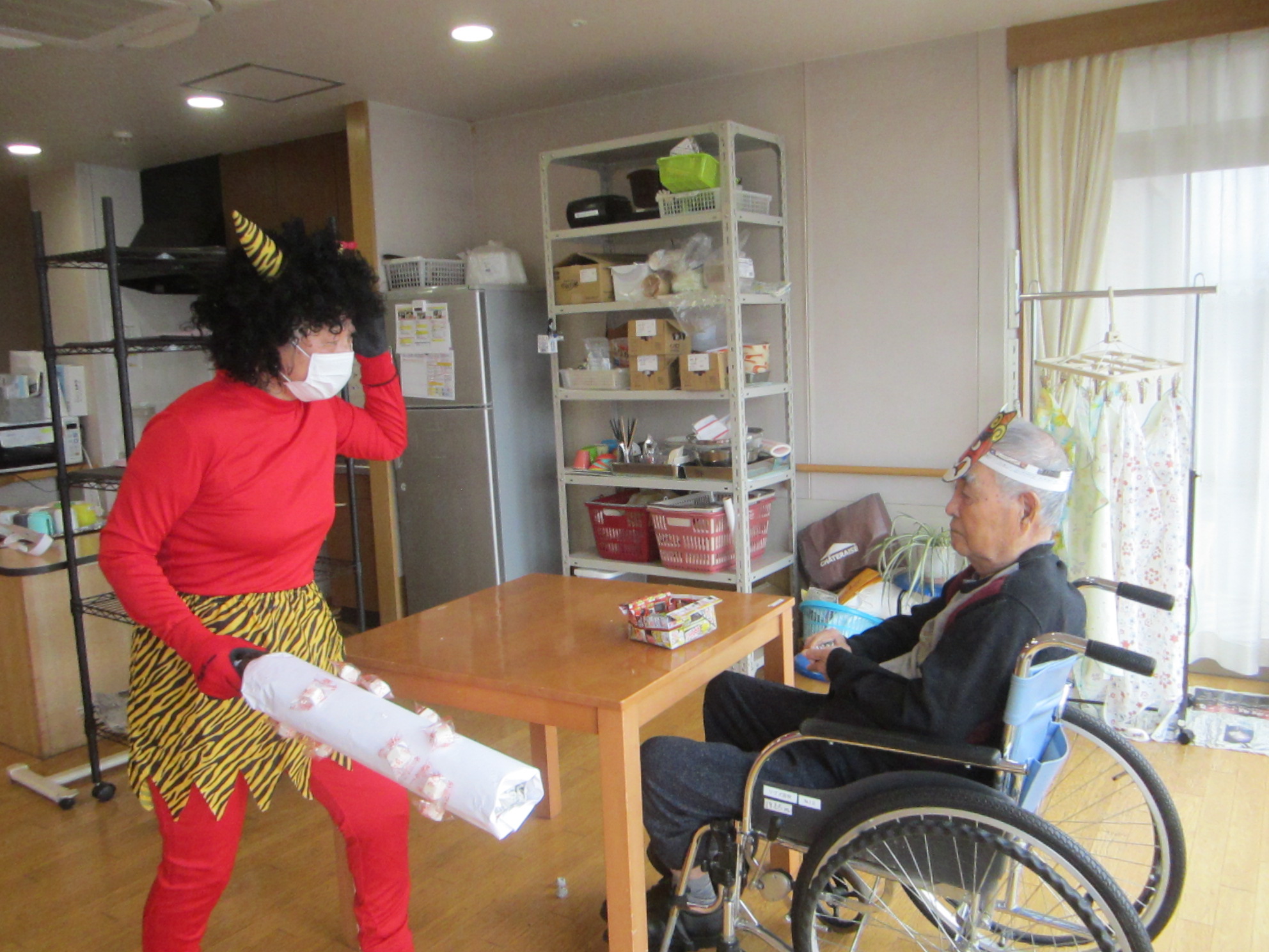 鬼に変装した職員に入居者様が豆を投げて盛り上がりました☺
