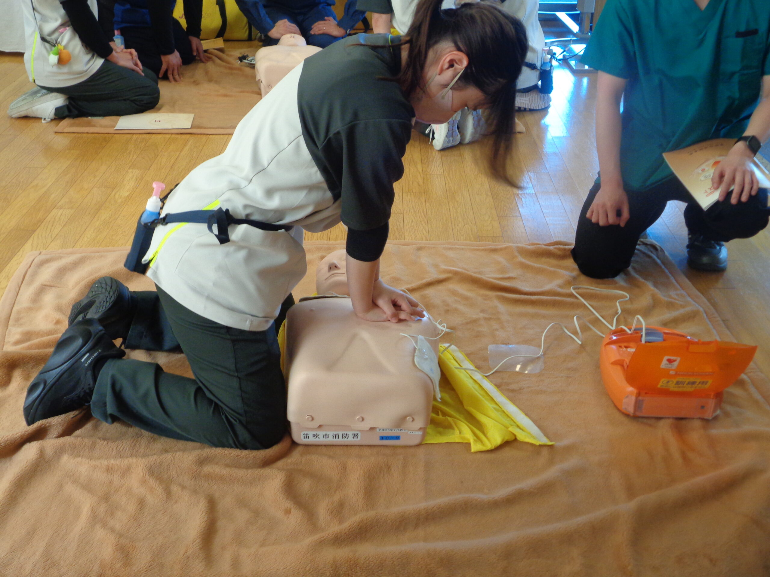 倒れている人の発見と反応確認、救急通報と応援依頼、胸骨圧迫(心臓マッサージ)、AEDの使用、安全確保について学ばせて頂きました。