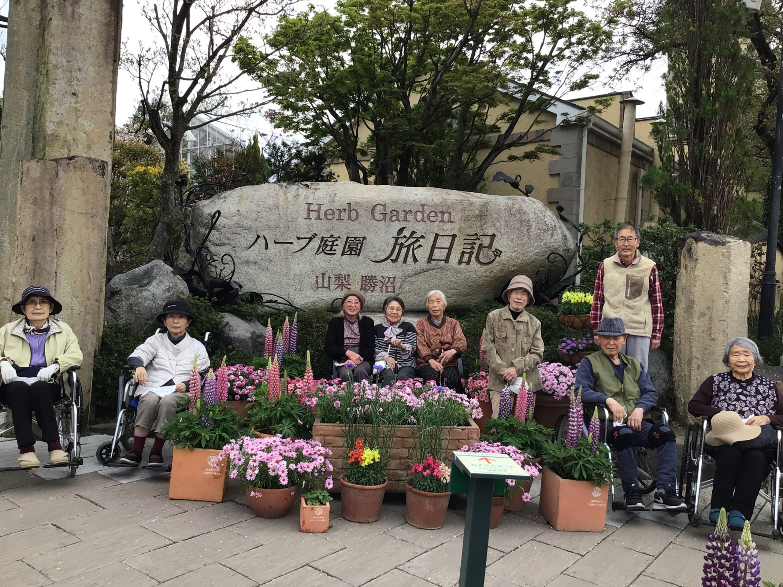 昇り藤(ルピナス)、カーネーション、ペチュニアなどに囲まれて記念撮影📸